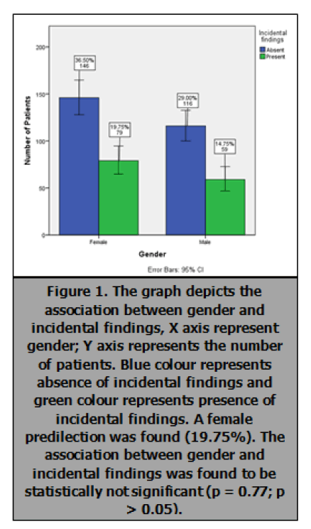 Figure 1. The graph drepicts the association between gender and incidental findings ,x axis represents gender;y axis reprtesents the number of patient.Blue colour represents absence of incidental findings and green colour represents presence of incidental finding. A female predilection was found (19.75%). The association between gender and incidental findings was found to be statisically not d=significant (p=0.77;p>0.05).